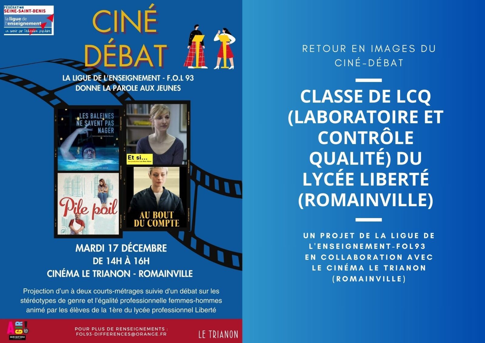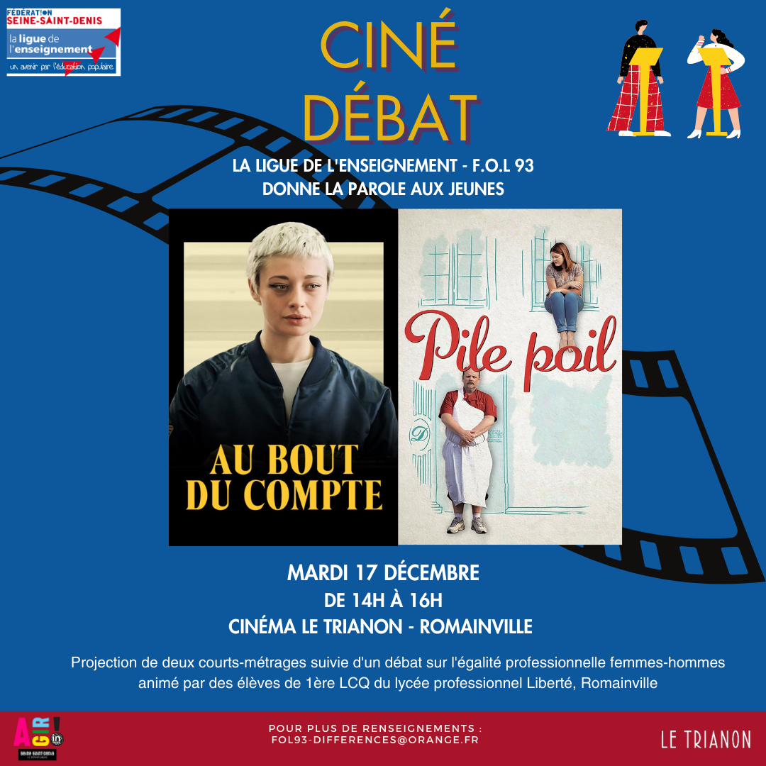 La ligue de l’enseignement – FOL 93 a organisé cette année la deuxième édition de son projet « Ciné débat » avec les élèves de la classe de 1ère LCQ (Laboratoire et contrôle qualité) du lycée Liberté de Romainville. Après plusieurs semaines de préparation, les 22 élèves ont pu organiser et animer un débat autour de l’égalité professionnelle entre femmes et hommes et les stéréotypes de genre, qui s’est tenu le mardi 17 décembre au cinéma « Le Trianon » à Romainville.
