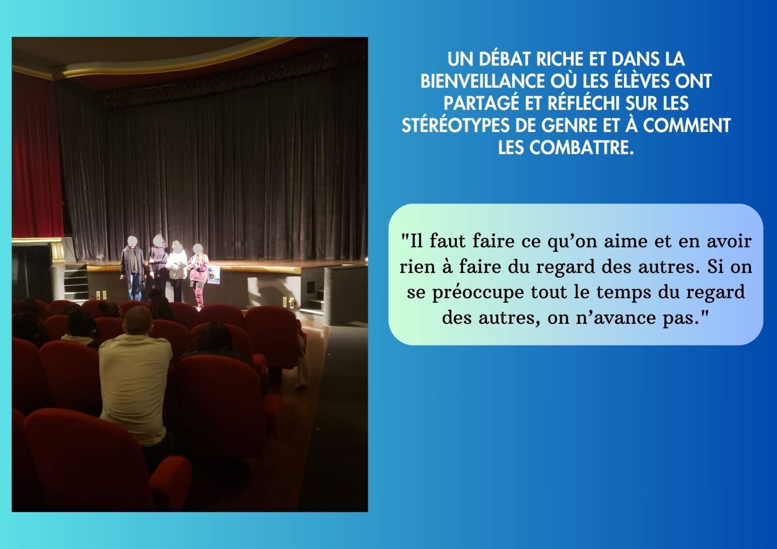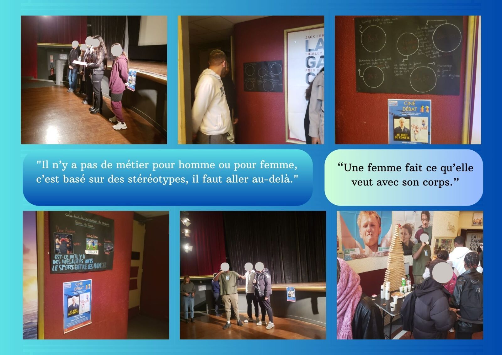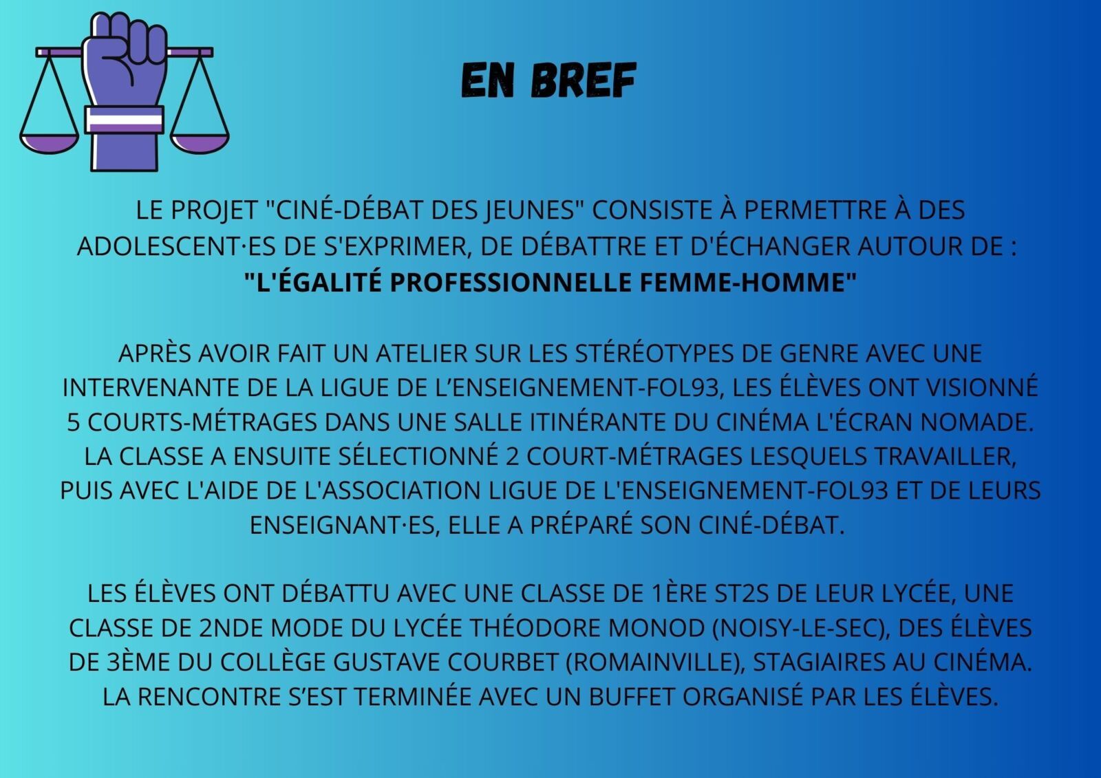 Accompagné·es de leurs enseignant·es (indiquer les noms) et de Nina Lostis, chargée de mission à la FOL 93, les jeunes du lycée « Liberté » ont brillamment animé le débat auquel ont participé les élèves de la classe de 1ère ST2S du lycée « Liberté », de la classe de 2nde Mode du lycée « Théodore Monod » de Noisy-le-Sec, ainsi que 6 stagiaires de 3ème du collège « Gustave Courbet » présent·es ce jour-là. Ce fut l’occasion pour les 63 participant·es donner leur point de vue sur un sujet qui les touche tout particulièrement en tant qu’élèves dde filières professionnelles souvent confrontés aux stéréotypes. Mme Sandrine Louët, conseillère municipale de la ville de Noisy-le-Sec, déléguée aux discriminations, à l’égalité femmes/hommes et aux violences envers les femmes a assisté à ce grand débat et a pu partager son expérience avec les jeunes participant·es. Cette 2ème édition de ciné-débat s’est achevée chaleureusement par un verre de l’amitié autour d’un buffet organisé par la classe de 1ère LCQ. La Ligue de l’enseignement – FOL 93 tient à féliciter toustes les participant·es, élèves et professeur·es pour tout le travail et l’engagement fournis qui ont fait de cet événement un moment mémorable et convivial. Pour en savoir plus sur ce projet imaginé et animé par la Ligue de l’enseignement-FOL93 cliquer ici .