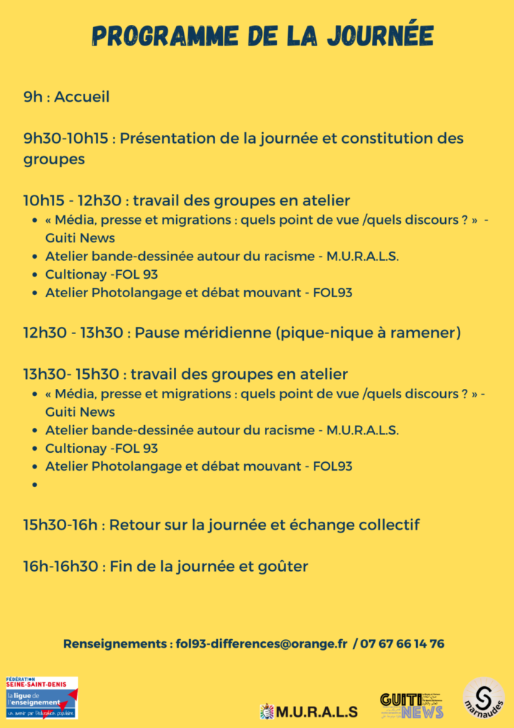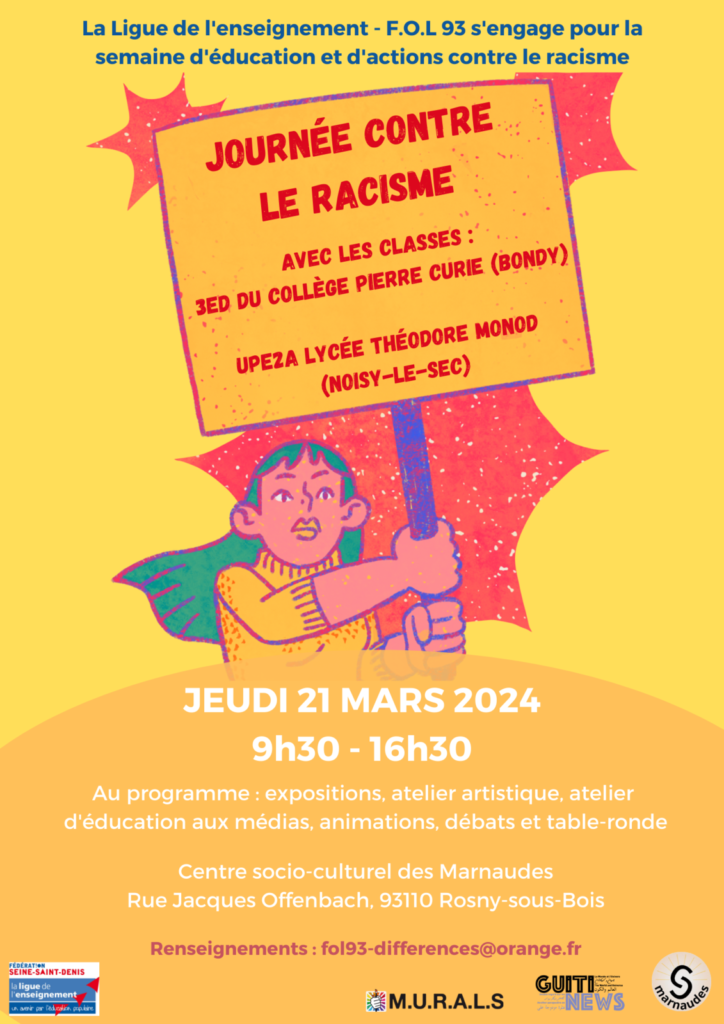 Jeudi 21 mars 2024, la Ligue de l’enseignement-FOL93 s’est mobilisée pour la Journée internationale pour l’élimination de la discrimination raciale avec le collège Pierre Curie de Bondy, le lycée professionnel Théodore Monod de Noisy-le-Sec et les associations MURALS et Guiti News. Tout au long de la journée, une classe de 3eme du collège Pierre Curie et une classe UPE2A du lycée Théodore Monod, ont participé à des ateliers de sensibilisation au racisme et aux discriminations raciales.